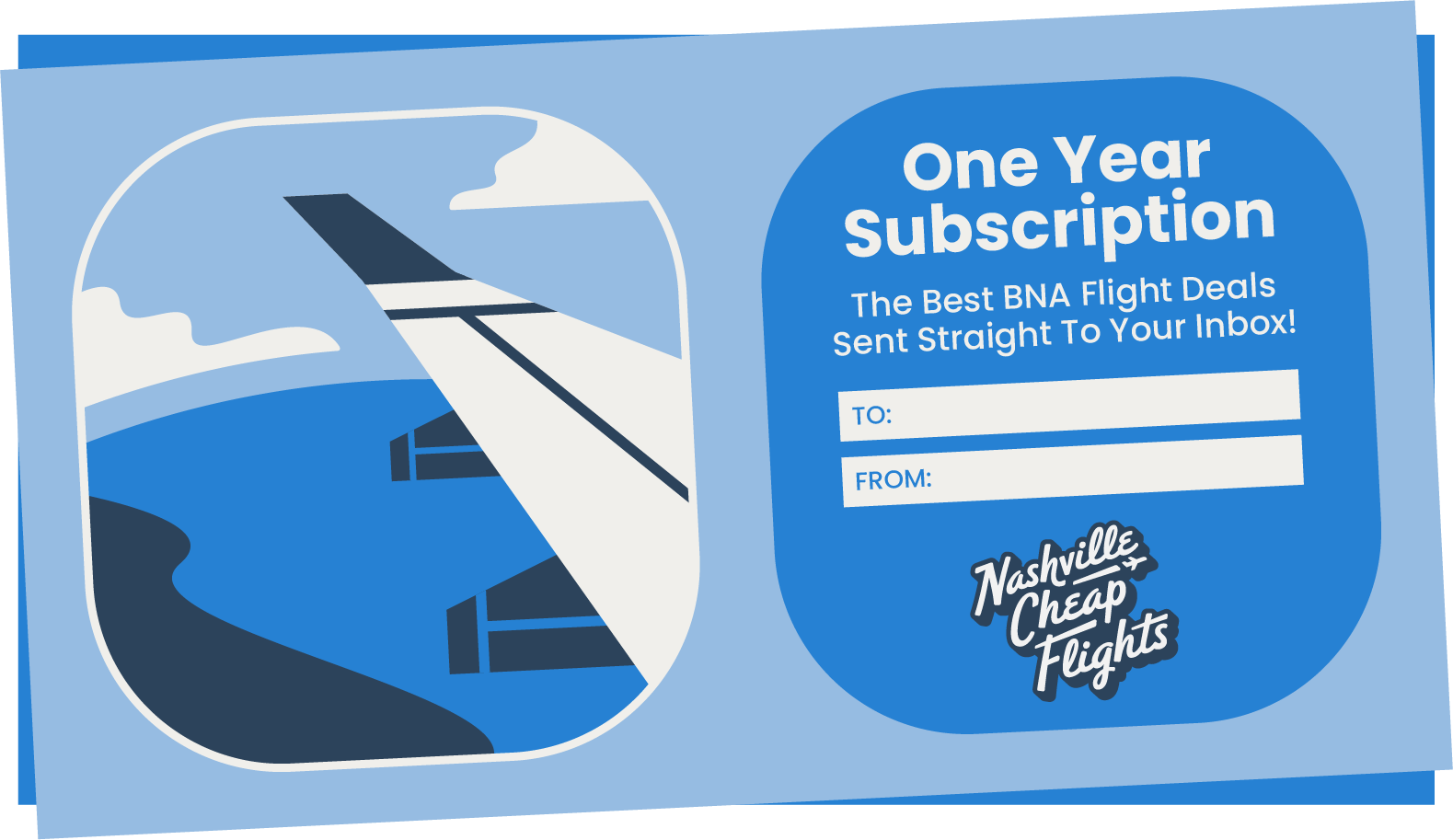 Your loved ones want to travel this year. Give them a year of BNA cheap flight alerts. For $49, you can gift someone a one-year Nashville Cheap Flights email alerts subscription. Plus, a downloadable gift certificate they can open this holiday.